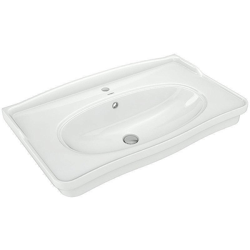 Раковина изготовлена из керамики с одним отверстием под смеситель и системой слива-перелива.