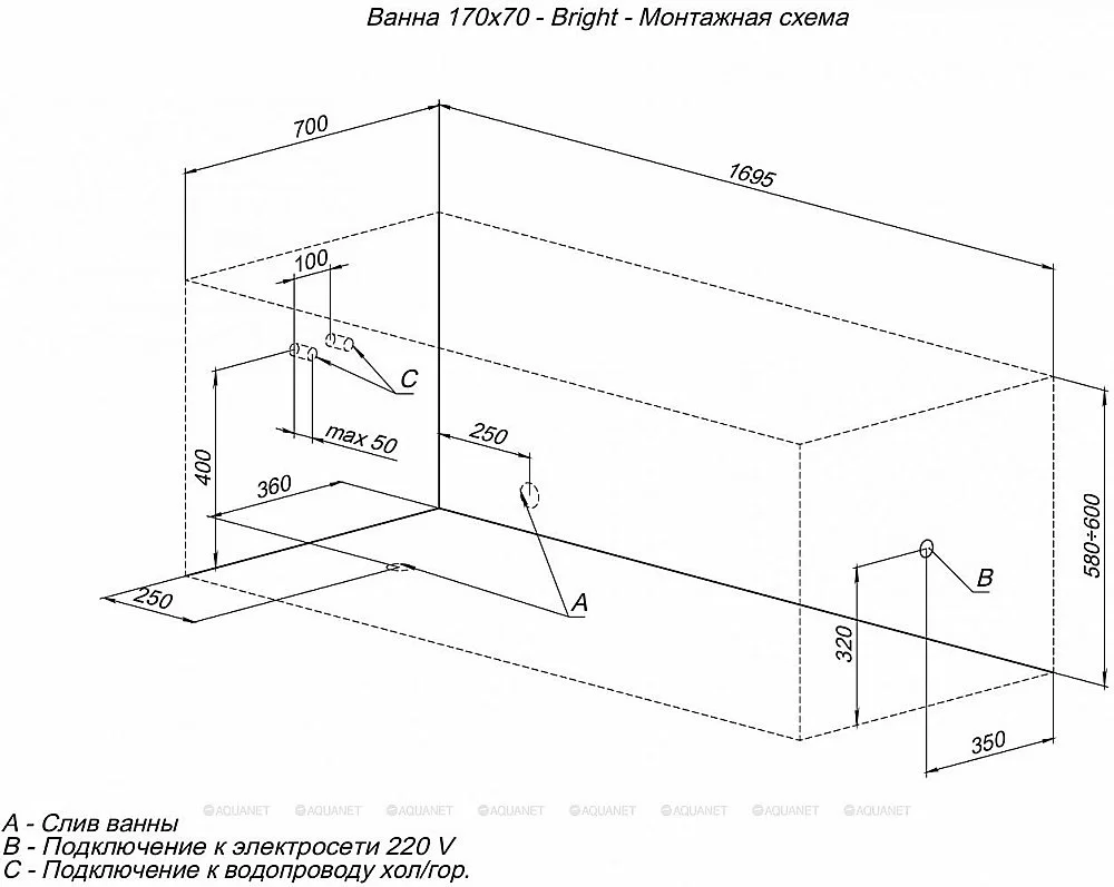 Акриловая ванна Aquanet Bright 170x70 создана с учетом растущего спроса на ванны простой прямоугольной формы в популярных размерах. Это модель с прямыми бортами и пологой спинкой, где соблюден идеальный угол для комфортного нахождения в ванне. Спинка плавно перетекает в бортик, поэтому релакс гарантирован даже без использования подголовника. Все линии ванны подчинены строгим законам эргономики. В современных условиях ширина ванны 70 см при длине 170 см - одно из популярных габаритов, так как прекрасно вписываются в стандартную планировку современных ванных комнат. Чаша в этой ванне устроена таким образом, что для обозначенных размеров в ней достигнут максимально возможный внутренний объем, а именно 190 литров, и это при комфортной глубине в 433 мм от слива ванны до борта. Ванна рассчитана на нагрузку свыше 300 кг, так что даже крепкий мужчина сможет без опаски находиться в ней. Двойной слой армирования обеспечивает надежность чаши, а закладные из МДФ-плит в местах наибольшей нагрузки усиливают эффект.