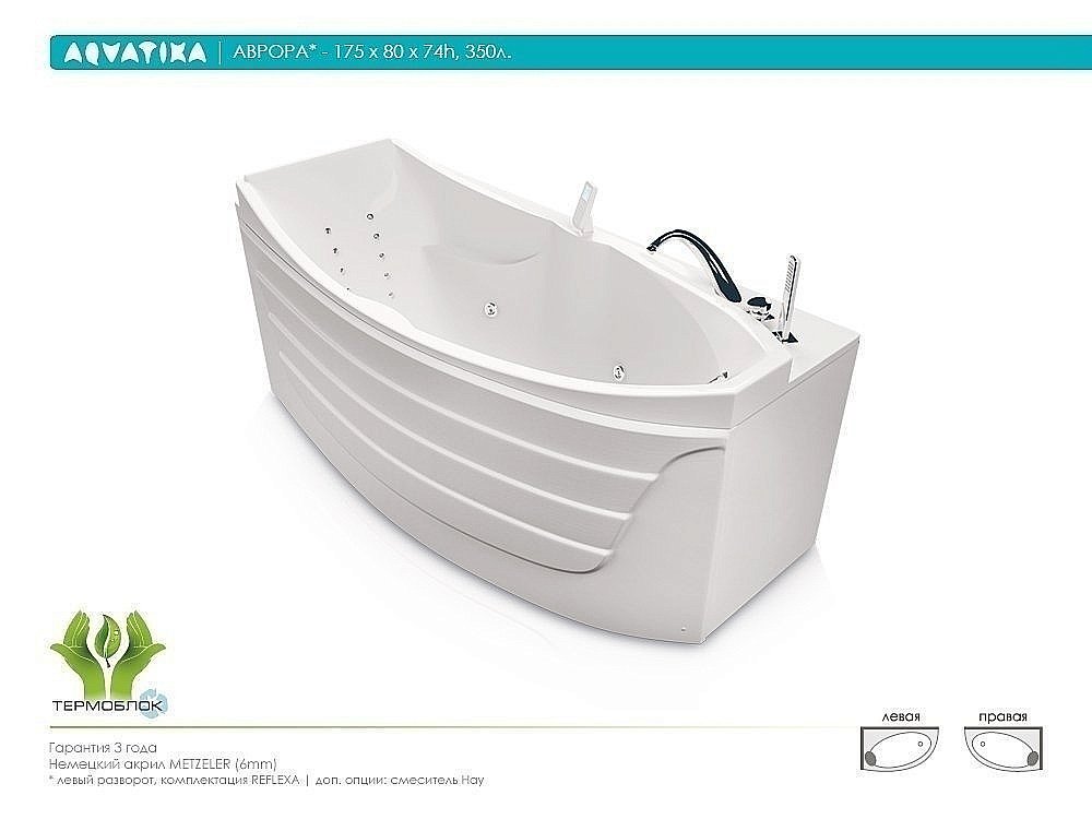 Гидромассажная ванна Aquatika Аврора Basic 175х80 левая