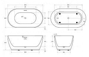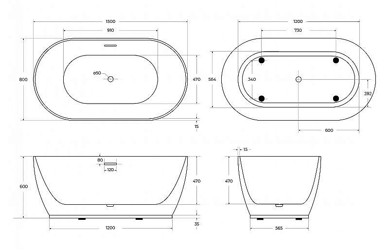 • Расположение перелива: сливное отверстие посередине дна ванны стандартно.