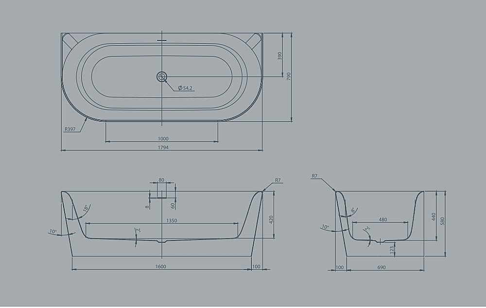 • Ванна пристенная 180х80х60см, с щелевым переливом, без слив-перелива, цвет белый (продается со сливом 0100-091-06).