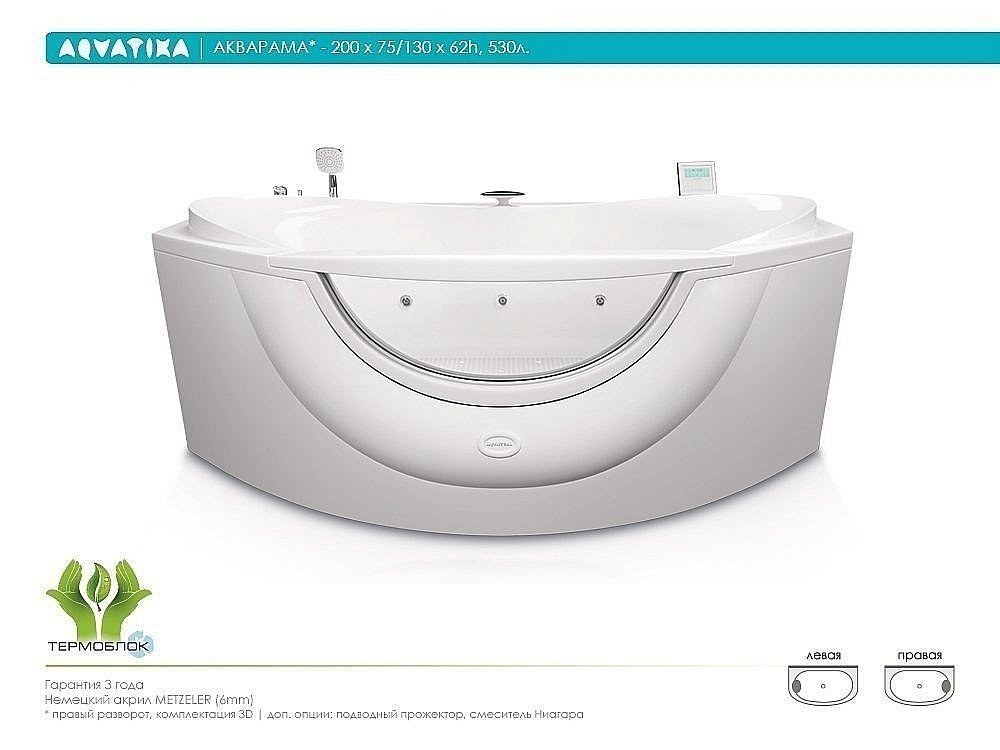 Радиусная акриловая ванна «Акварама» призвана превратить традиционную гигиеническую процедуру в поистине великолепный процесс! Увеличенная чаша объемом 530 литров может свободно вместить в себя несколько купальщиков. Множество гидромассажных форсунок снимут напряжение и подарят заряд бодрости и свежести.