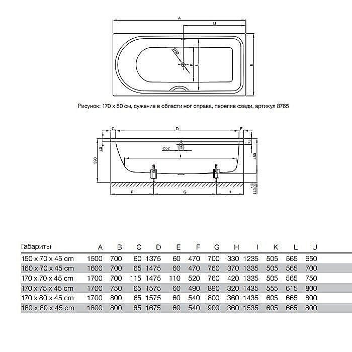 Ванна с шумоизоляцией, перелив сзади (для удлиненного слива-перелива).