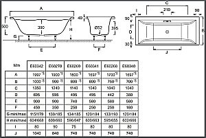 Технические характеристики • Размеры (см): 170 x 80 см • Вес: 22 кг • Объем: 242/172 • Диаметр слива: 5.2 см • Дополнительная опция: Встроенный подголовник • В комплекте: Регулируемые ножки (быстрая установка) • Размеры основания: 104 x 49.5 см • Доступна с системой гидромассажа