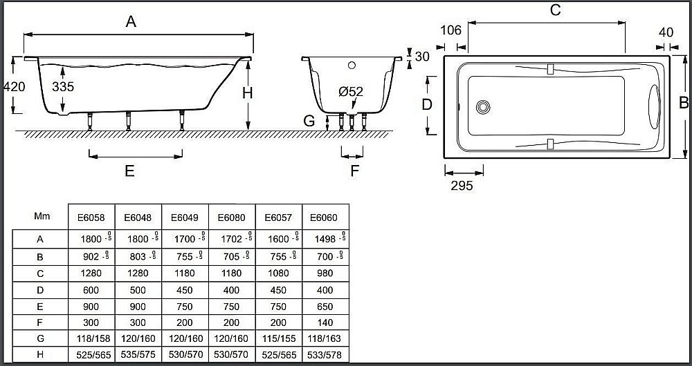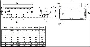 Технические характеристики • Размеры (см): 160 x 75 см • Вес: 16 кг • Материал: Акрил • Тип установки: Встраиваемые • Объем: 190/120 • Форма: Прямоугольные • Высота ножек: 115/155 • Диаметр слива: 5.2 см • Дополнительная опция: Автоматический слив-перелив (1м) E70174, экран на прямоугольную ванну E4932 • В комплекте: хромированные ручки, черная подушка и регулируемые ножки (быстрая установка) • Размеры основания: 108 x 45 см • Доступна с системой гидромассажа