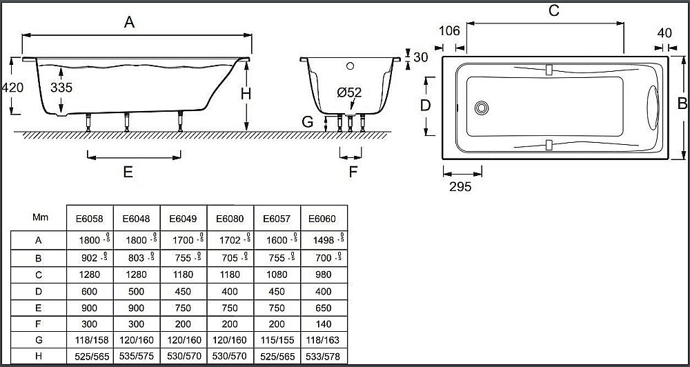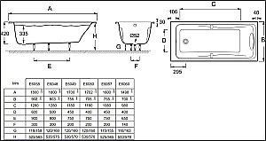 Технические характеристики • Размеры (см): 170 x 70 см • Вес: 16,5 кг • Материал: Акрил • Тип установки: Встраиваемые • Объем: 185/115 • Форма: Прямоугольные • Высота ножек: 120/160 • Диаметр слива: 5.2 см • Дополнительная опция: Автоматический слив-перелив (1м) E70174, экран на прямоугольную ванну E4932 • В комплекте: хромированные ручки, черная подушка и регулируемые ножки (быстрая установка) • Размеры основания: 118 x 40 см • Доступна с системой гидромассажа